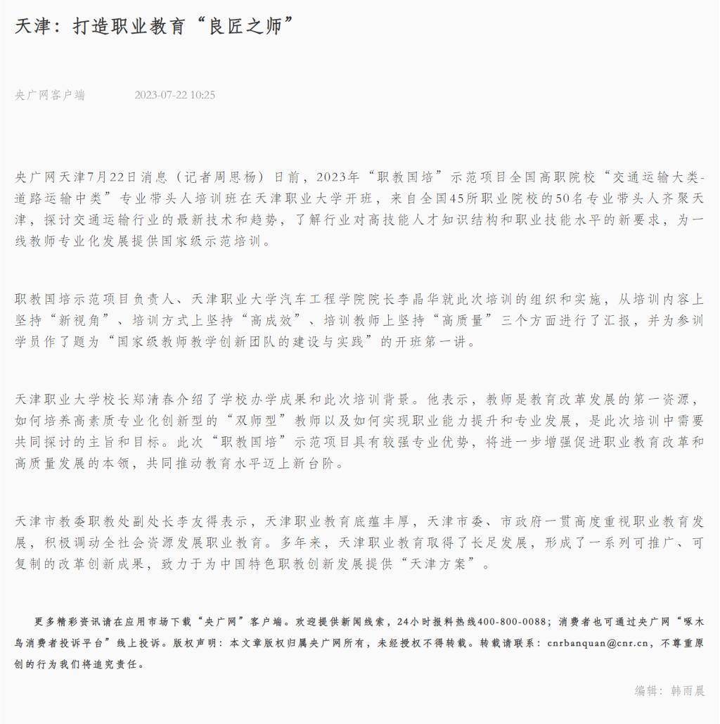 央广网天津7月22日消息(记者周思杨)日前,2023年“职教国培”示范项目全国高职院校“交通运输大类-道路运输中类”专业带头人培训班在best365英国在线体育官网开班,来自全国45所职业院校的50名专业带头人齐聚天津,探讨交通运输行业的最新技术和趋势,了解行业对高技能人才知识结构和职业技能水平的新要求,为一线教师专业化发展提供国家级示范培训。