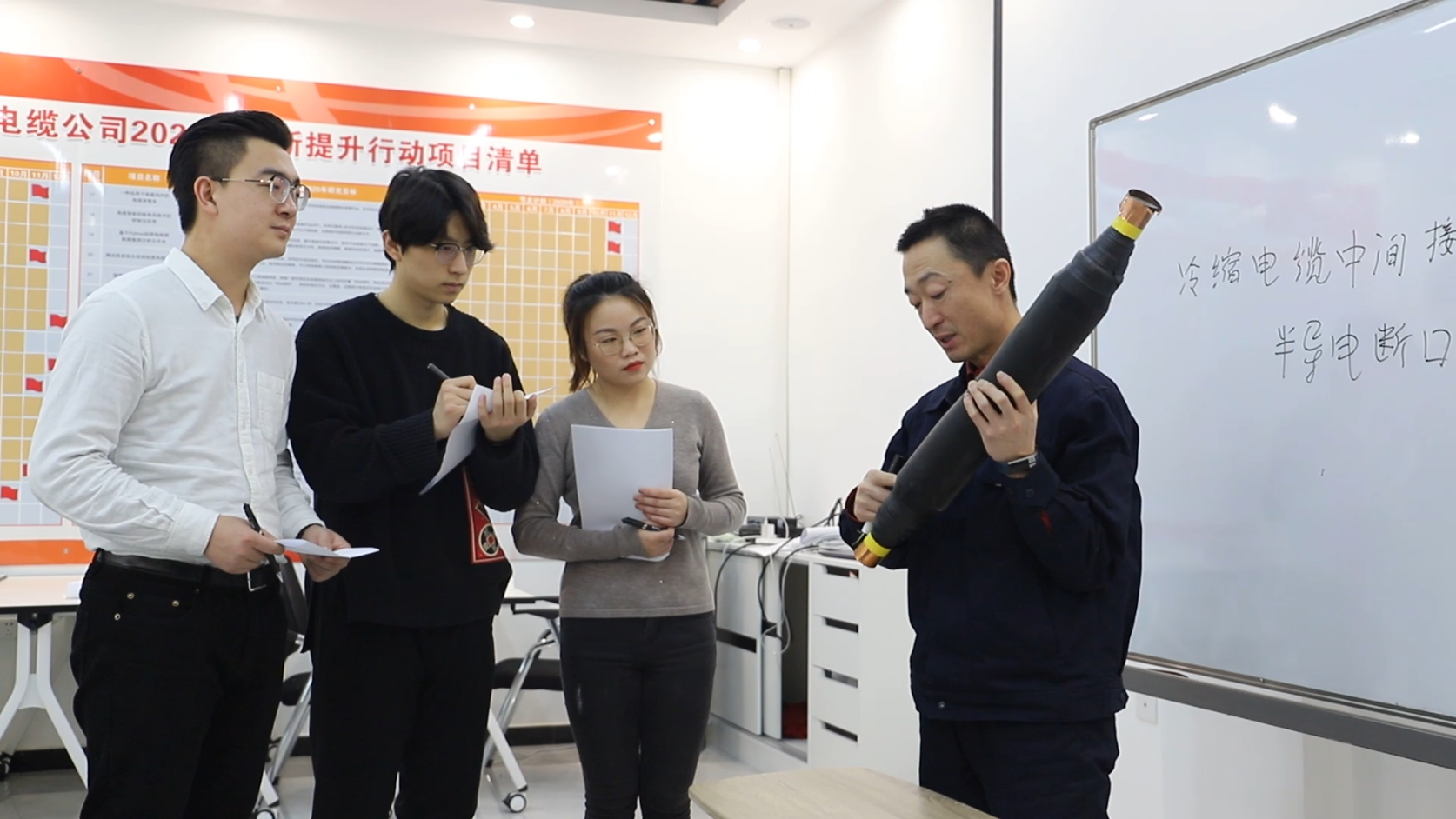 张华(右)在讲解电缆相关知识(央广网发 国网天津电缆公司供图)