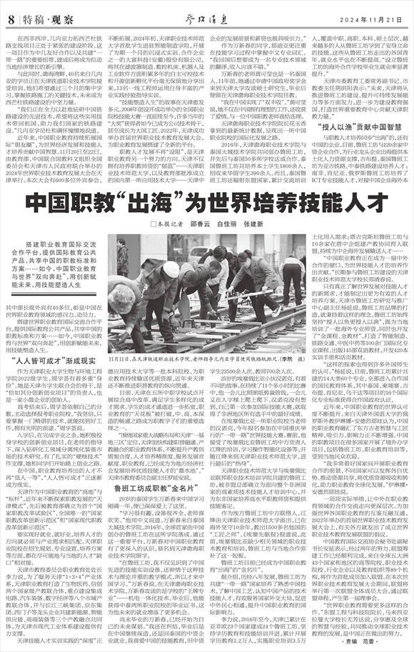 “围绕国家重大战略布局和天津‘一基地三区’定位,天津加快构建职普融通、产教融合的职业教育体系,不断提升产教供需契合度、人才培养精准度、服务发展贡献度。职业教育,已经成为为地方经济社会发展培养优质技能人才的‘蓄水池’。”天津市教育委员会副主任罗延安说。